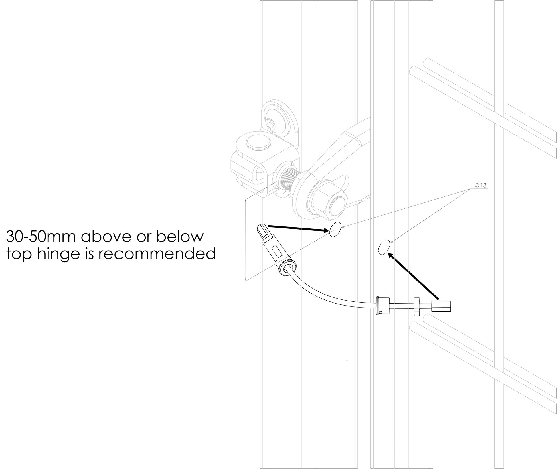 Simply drill a 13mm hole into the gate and a corresponding 13mm hole into the post, and slot the end stops through the holes. The plastic bushes then push into the holes to give a neat finish and to prevent the wire from scratching the gate.